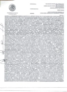 3. El Inspector revisará de manera exhaustiva, todos y cada uno de los documentos aplicables al centro de trabajo; después realizará un recorrido por las instalaciones, en compañia del Representante Legal de la empresa, Representante de los trabajadores e Integrantes de la Comisión de Seguridad e Higiene. Finalizado este, dictará una serie de medidas de seguridad e higiene, imprimirá e invitará a todas las partes a firmar la misma. Le entregará un ejemplar de la misma